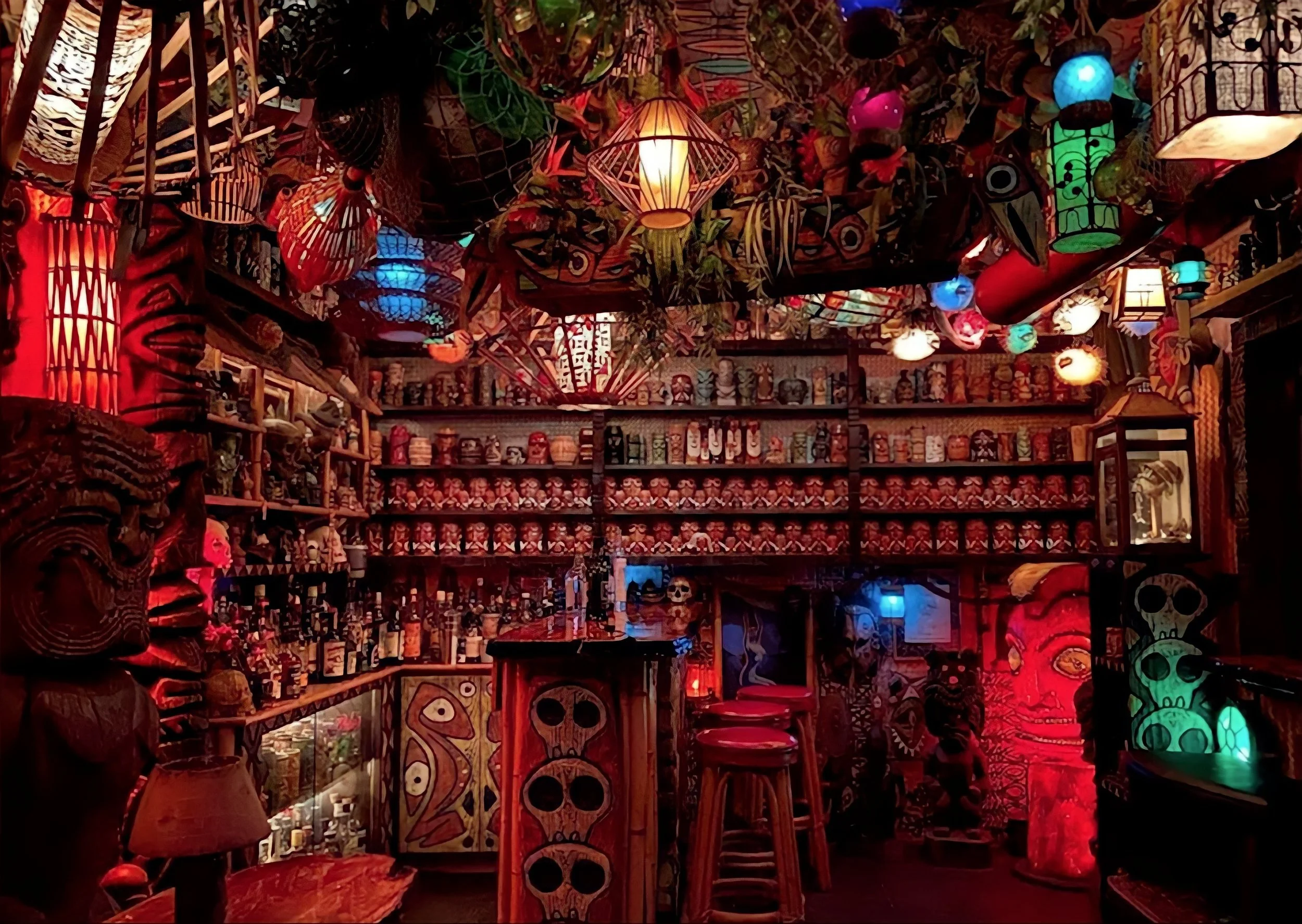 The Head Hunter Tiki bar is a custom, 17ft high A-Frame Tiki bar that Jonny and Ilze created to house their massive, lifetime collection of vintage, South Pacific paraphernalia. The bar features a replica, vintage bar, a booth for their guests, beautiful lighting, and hundreds, if not thousands of incredibly ornate, detailed, rare and authentic vintage items.