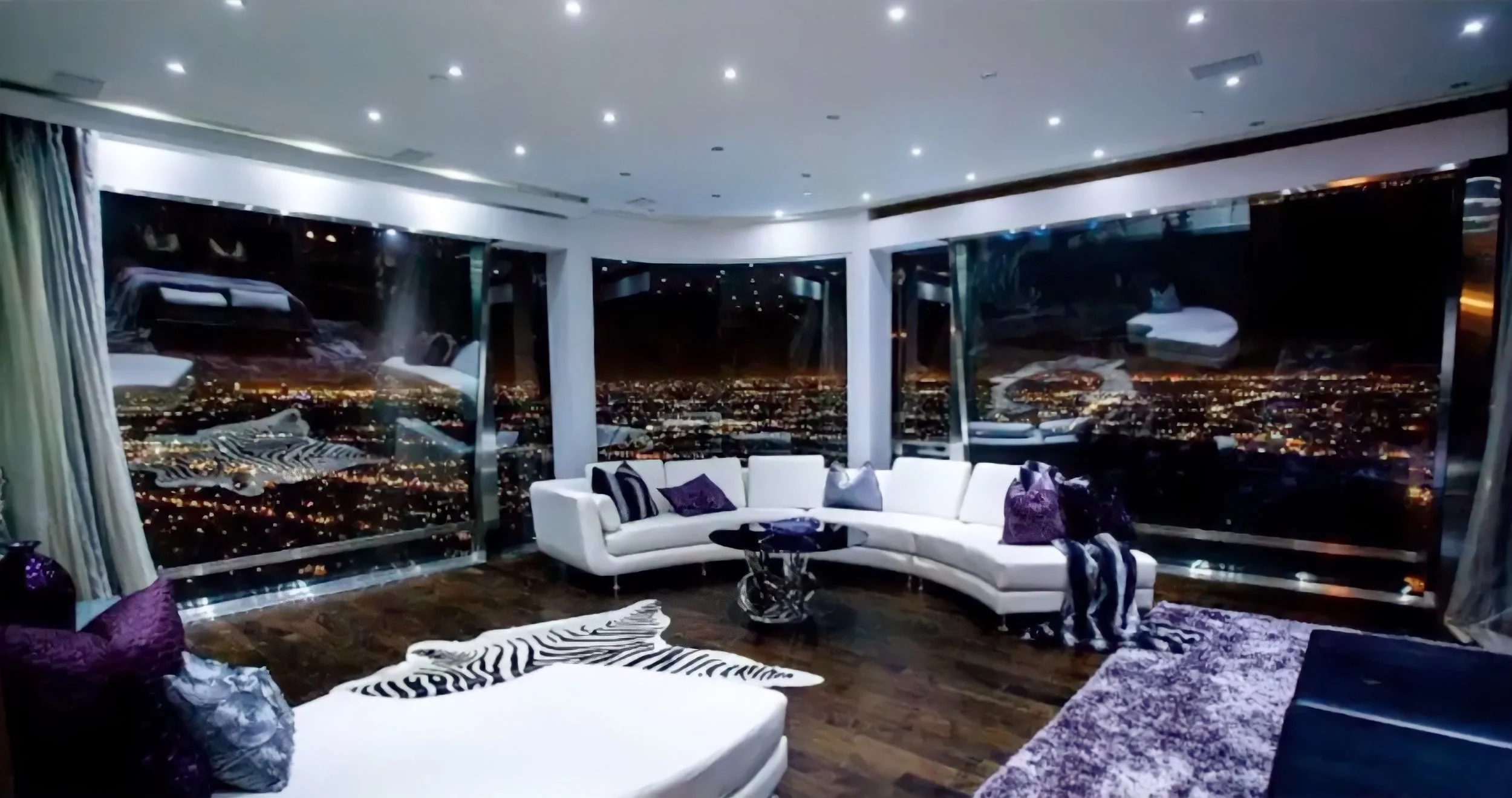 The first thing people say when they walk into the home is: "Wow, I feel like I want to take my clothes off in here!" Not entirely sure what that means, but it’s a good start! The home is a sky-high, multi-level home with stunning views of Los Angeles. Visitors are greeted by a full-sized spider man statue, and then enter a grand foyer with a massive spiral staircase accented by a chandelier dripping in faux gems. The bar and kitchen area boasts bling worthy design: a snake skin dining table and disco-ball like, mirrored fireplace and matching bar. With room after room of with awe inducing views, and a style that seems lifted from a nightclub, this is clearly the ultimate party pad. Nicole's parties are epic and legendary. One of her favorites was an angels and demons party where every level of the home was either heaven or hell themed and people came wearing white, black, or red. If you were in white you received an LED light halo, and if you were wearing black or red you would receive horns to wear. One of her famous parties had over 400 people in attendance! It’s rumored that TYGA even rented her house from her for a special party!